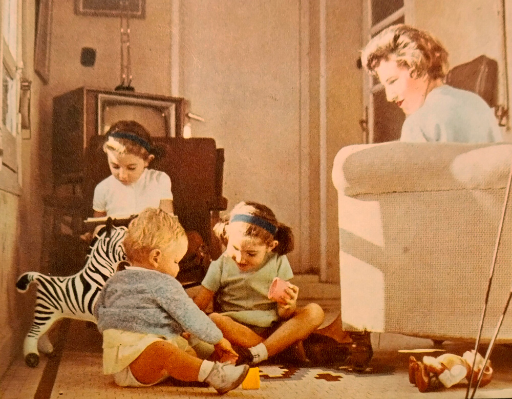 Tres niños boomers de la primera hornada juegan bajo la atenta mirada de su madre, en esta fotografía publicada en el libro de propaganda España (1962).