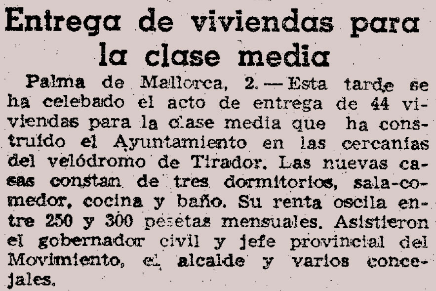 De seis o cinco habitaciones, las viviendas se pagaban en 20 años, y estaban destinadas a imponentes o impositores de la Caja, «encuadrados en la llamada clase media»(1). Este tipo de rituales eran bastante corrientes en la década de 1950. Una noticia localizada en Palma de Mallorca, en 1952, «Entrega de viviendas para la clase media» informaba de la ceremonia de entrega, presidida por las autoridades locales, de 44 viviendas de tres dormitorios, sala-comedor, cocina y baño. Estas viviendas eran de alquiler (2).