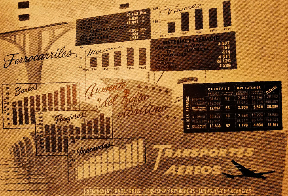 El INE celebró su 75 aniversario en 2020. En 1956 el centenario de la estadística española fue la oportunidad para inaugurar el nuevo estilo de propaganda estadística (no es un término peyorativo, sino oficial), con una mega-exposición en la que se exhibieron alrededor de 800 piezas procedentes de decenas de servicios oficiales, desde el Servicio Nacional del Trigo a Correos y Telégrafos. La exposición contaba con fotografías, maquetas, objetos diversos y sobre todo con un despliegue de paneles ilustrados, mostrando gráficos en los que barras y líneas serpentean mostrando el progreso del país, acompañados de ilustraciones alusivas. Por ejemplo, “Un gráfico del descenso de reclusos” y “un mapa industrial penitenciario” entre los diversos proporcionados por el Ministerio de Justicia, o “Gráfico de la disminución del clero”, de la Oficina Estadística de la Iglesia. El Ministerio del Ejército aportó dos fusiles-ametralladores, entre otros muchos objetos y varios gráficos. El stand más sensacional era el de IBM, que presentó una computadora, al parecer el modelo 604, la primera comercializada en masa. En resumen, la exposición quería “medir a España en su actividad y en su espíritu” (5).